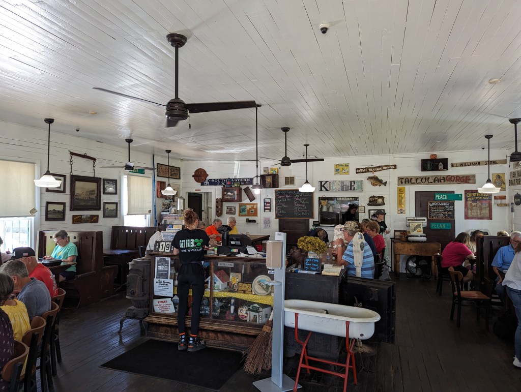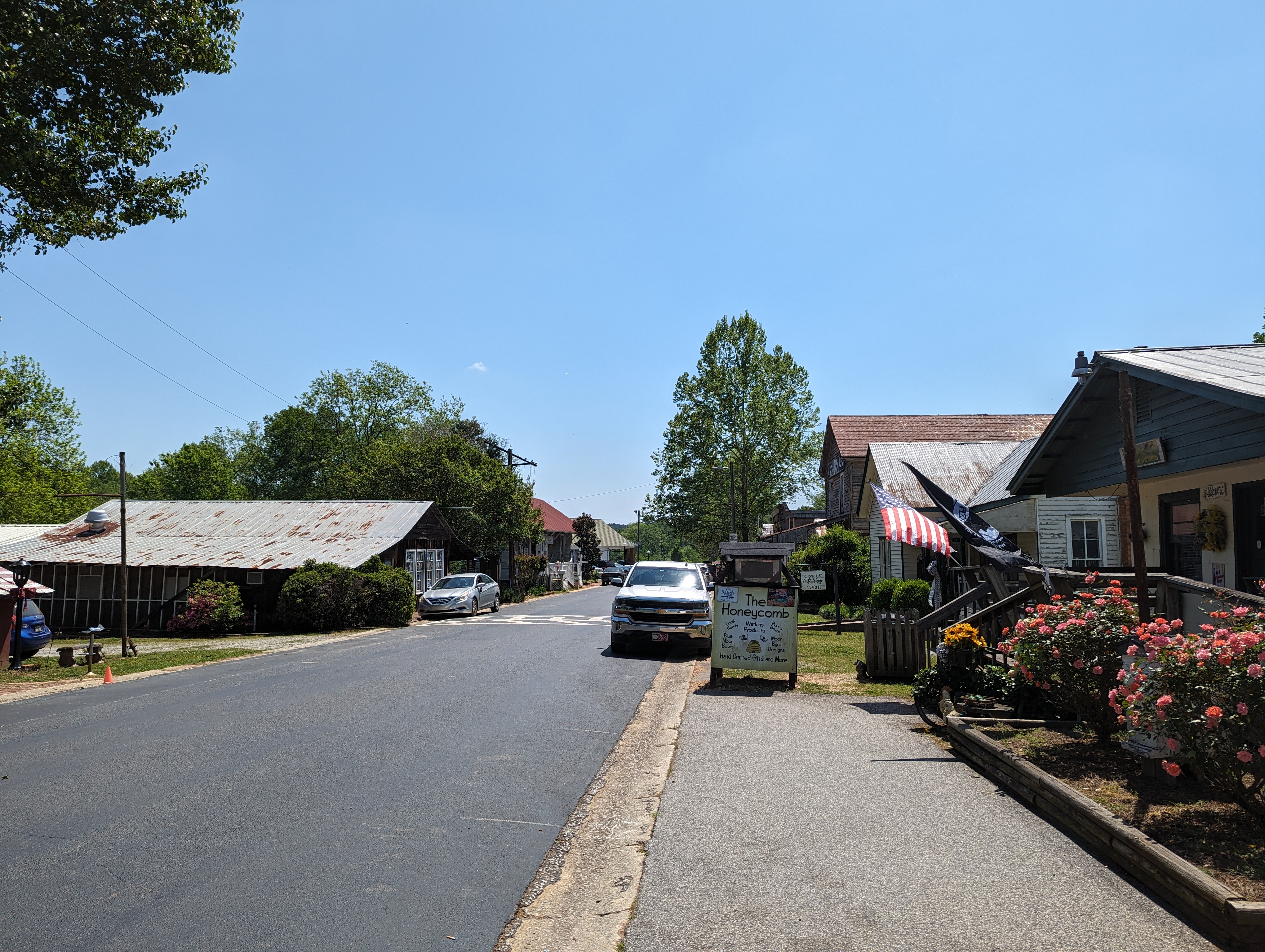 I need to research the history of this town, but this strip is apparently owned by one person who has wisely oriented it towards the idolization of Fried Green Tomatoes. All of the shops sell FGT-related materials along with their peculiar specialties (antiques, books, oil paintings).