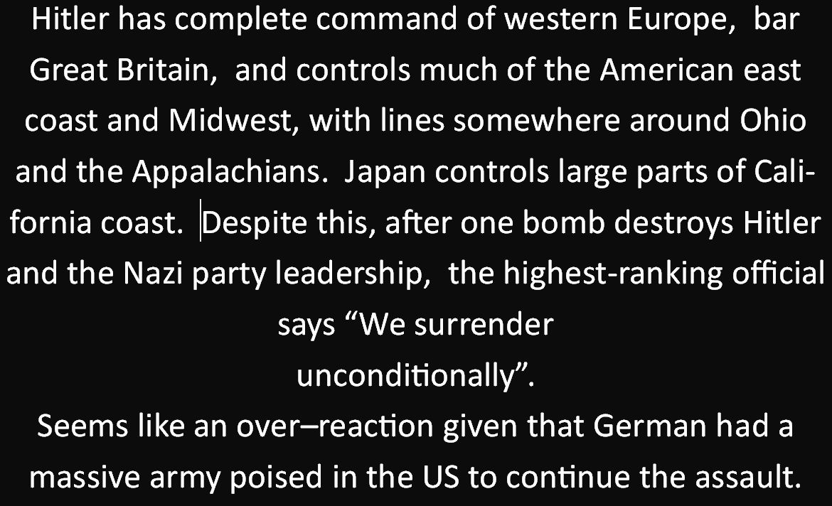 So, 1945. Hitler has complete command of Western Europe,  aside from Britain.  He also has military control over the eastern seaboard down to Virginia, and covers the midwest nearly to Chicago.   The Japanese control parts of the west coast.  But the Americans drop one a bomb and the surviving Nazi/military leadership is like "Welp, that's the war, we surrender unconditionally."
