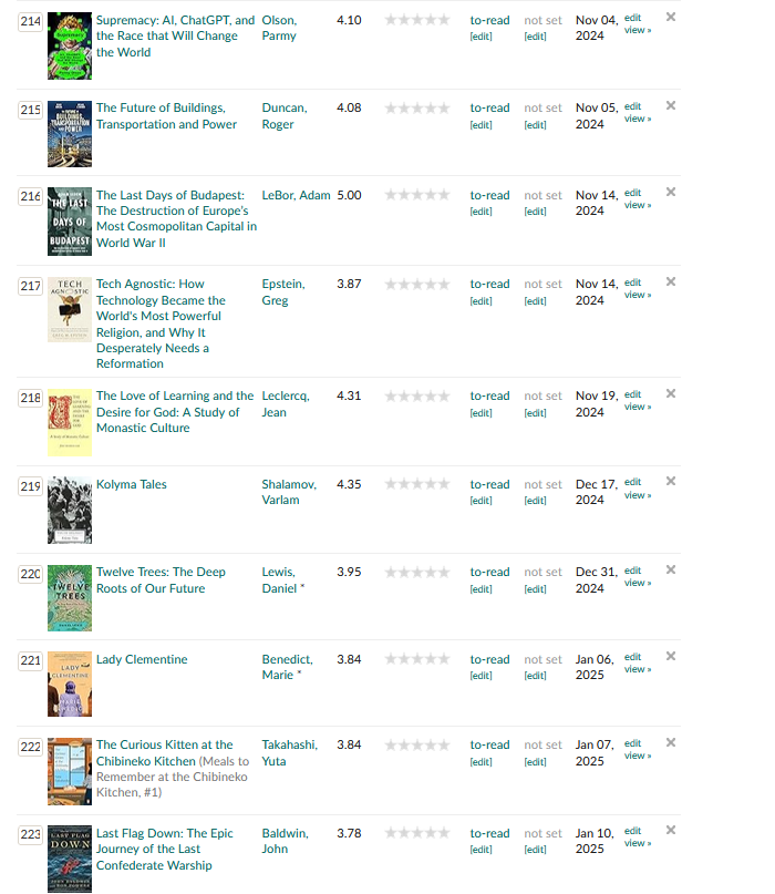 Surpremacy: AI, ChatGPT, and the Race that Will Chang the World; The Future of Buildings, Transportation, and Power; The Last Days of Budapest; Tech Agnostic; The Love of Learning and the Desire for God; Kolyma Tales; Twelve Trees; Lady Clementine;  The Curious Catton at the Cibenko Kitchen; Last Flag Down