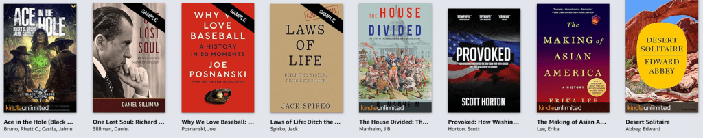 WHAT are you reading now? I was reading One of Us, a 700 page biography of Nixon, but then I spilled coffee on it. Zut alors! Here’s the Kindle shelf: