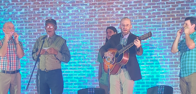 Comedian/storyteller Adam Booth, Charlie “The Tin Man” Lucas, two musicians, and the current president of Arts Revive