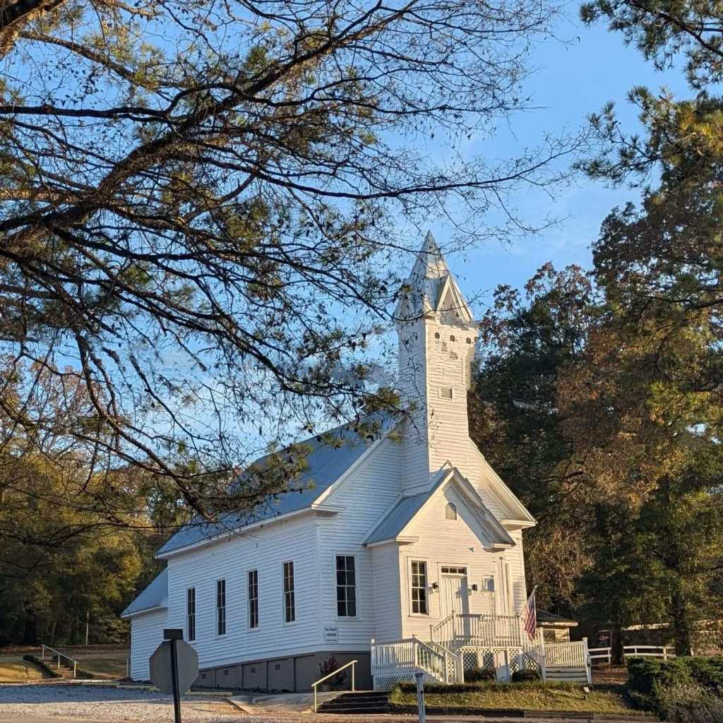 I have driven by this church for 20+ years (Hwy 139, Alabama) and have often waned to take a photo of it. The afternoon light was just right one Saturday. Photo by me; powerlines removed by a friend.