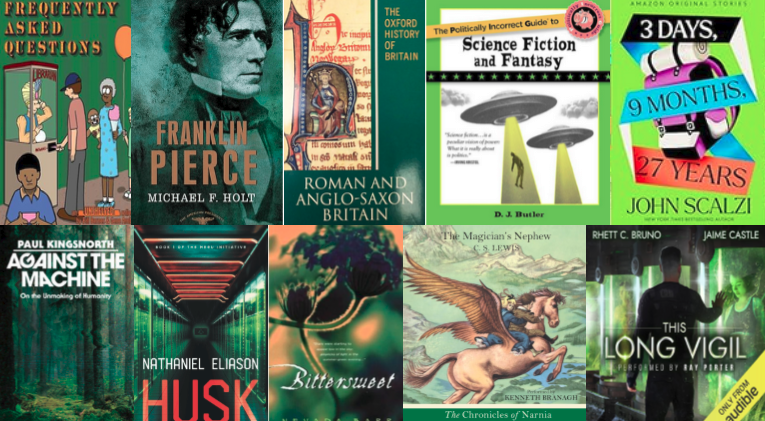 Today’s treble T is books with green book covers, in honor of St. Patrick, whose feast day is today. He is the patron saint of Ireland and green rivers. Funny story: blue was originally the color associated with St. Patrick, not green. So, if someone goes pinchin’ ya while wearing azure blue, you can give them a lecture. Cover-oriented lists are the worst, Patrick, because I don’t really remember books by their cover: I don’t judge them by that, ya see? I’m just going to have to trawl my posts looking for greenery..
